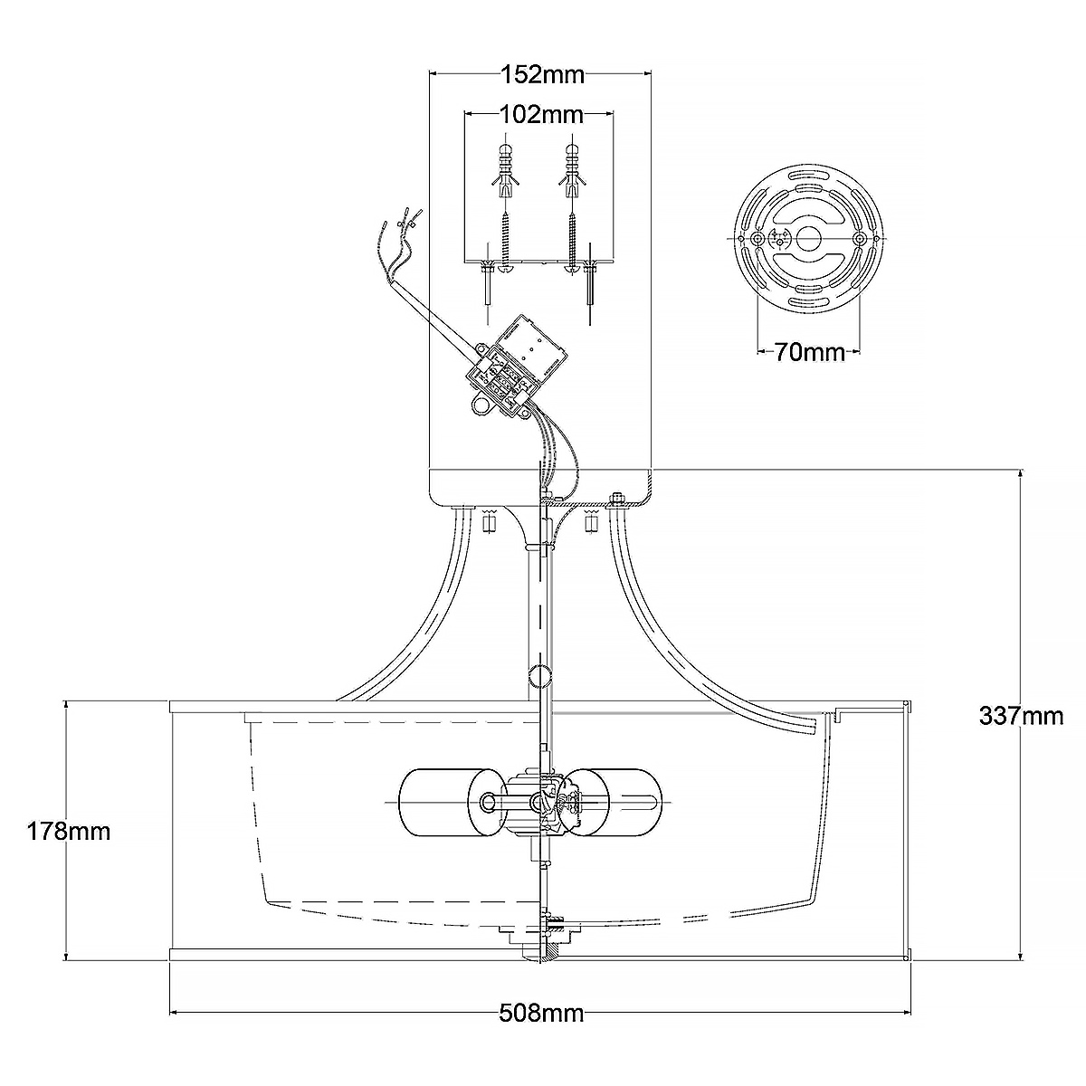 3 лампы Е14: Д27.8 х В38.1 см.